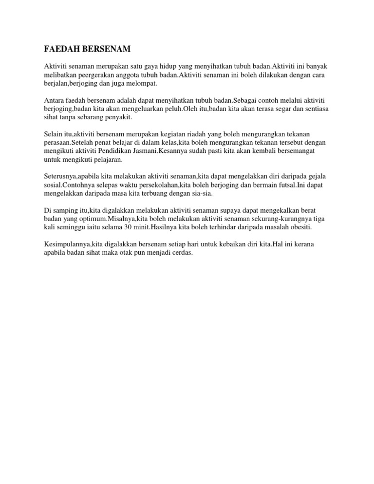 Contoh Karangan Faeadah Bersenam Darjah 4 By Vi_Mariana962 16 Jun, 2022 Post a Comment Contoh Contoh Karangan Sekolah Rendah Fakta Senaman Asas Kesihatan Pdf Contoh Karangan Faedah Bersenam Oerotoh Otosection Karangan Fakta Kebaikan Bersenam Pdf Faedah Bersenam Pdf Faedah Dan Kebaikan Bersenam Pdf Share No comments for "Contoh Karangan Faeadah Bersenam Darjah 4"